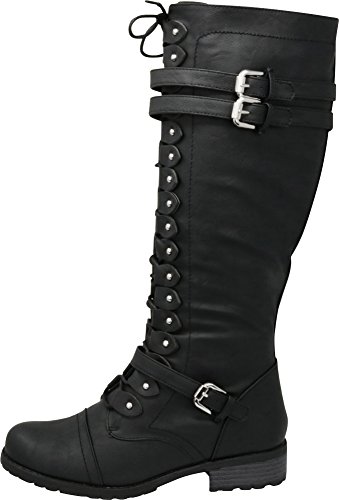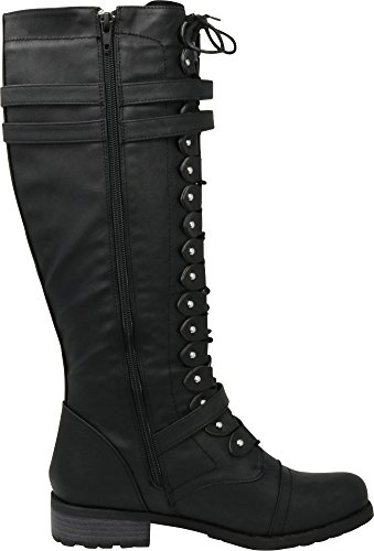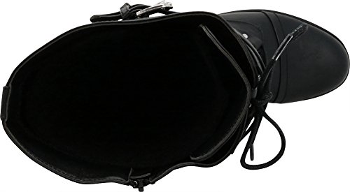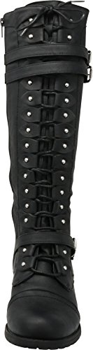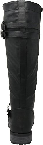 This knee-high, riding-inspired boot from Cambridge Select features a closed, round toe with cap stitching, inner zip for easy on/off, adjustable lace-up and buckled wraparound strap closures for a perfect fit, non-slip, lug sole, and low, block heel for all-day walkable comfort. Imported.