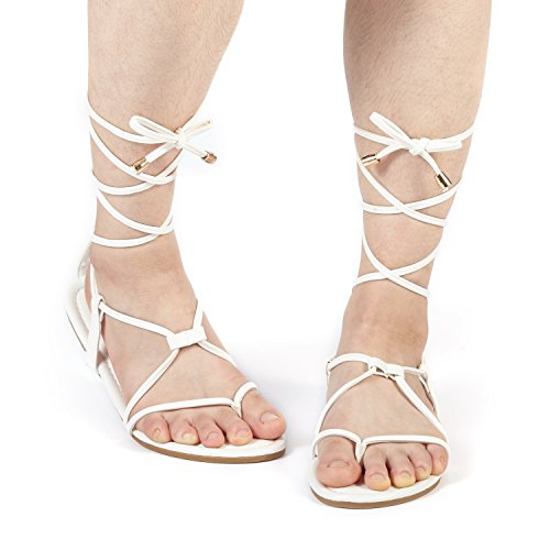 Strappy sandal that laces up foot and around ankle with corded leather straps.