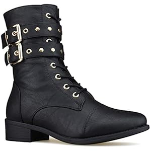 Premier Standard – Strappy Buckle Lace Up Combat Mid-Calf Boots – Low Heel Side Zipper Comfortable Stacked Heel Boots